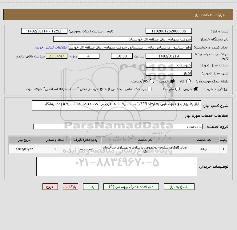 شرح کلی نیاز: تابلو چلنیوم بدون روشنایی به ابعاد 5*1.7 پست برق شمالغرب پرداخت مفاصا حساب به عهده پیمانکار
