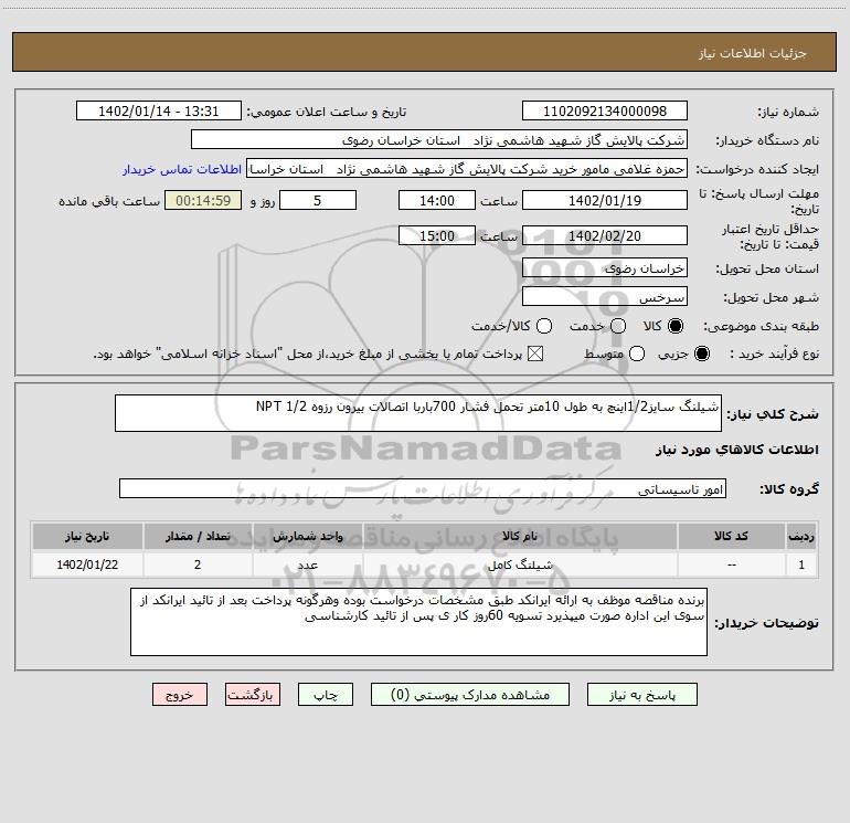 نام دستگاه خریدار:شرکت پالایش گاز شهید هاشمی نژاد استان خراسان رضوی