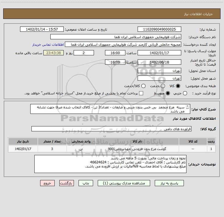 شرح کلی نیاز: سینه مرغ منجمد بی خس بدون چربی و ضایعات - تعداد:3 تن - کالای انتخاب شده صرفا جهت تشابه می باشد