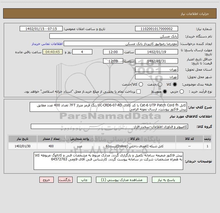 شرح کلی نیاز: کابل Cat-6 UTP Patch Cord fh با کد کالای UC-CRD6-07-RD رنگ قرمز متراژ 7FT تعداد 400 عدد مطابق پیش فاکتور پیوست. ارسال نمونه الزامی