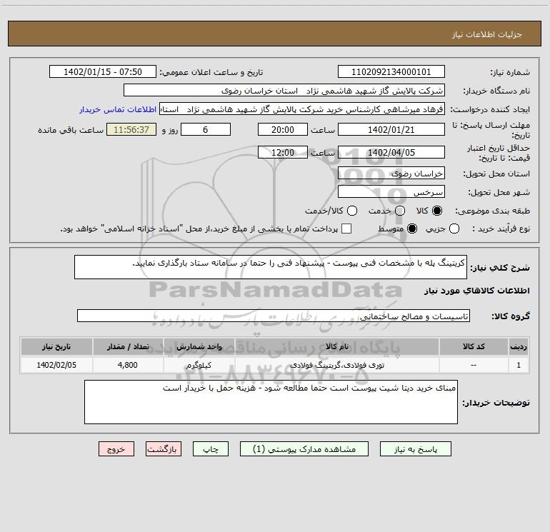 نام دستگاه خریدار:شرکت پالایش گاز شهید هاشمی نژاد استان خراسان رضوی