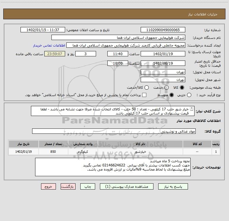 شرح کلی نیاز: خیار شور حلب 17 کیلویی - تعداد : 50 حلب - کالای انتخاب شده صرفا جهت تشابه می باشد - لطفا قیمت پیشنهادی بر اساس حلب 17 کیلویی باشد