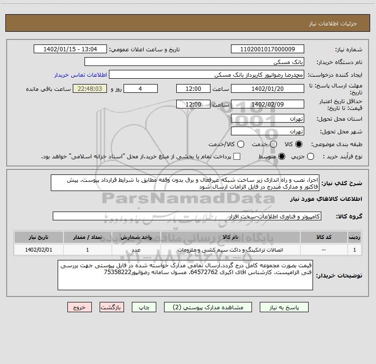 شرح کلی نیاز: اجرا، نصب و راه اندازی زیر ساخت شبکه غیرفعال و برق بدون وقفه مطابق با شرایط قرارداد پیوست. پیش فاکتور و مدارک مندرج در فایل الزامات ارسال شود