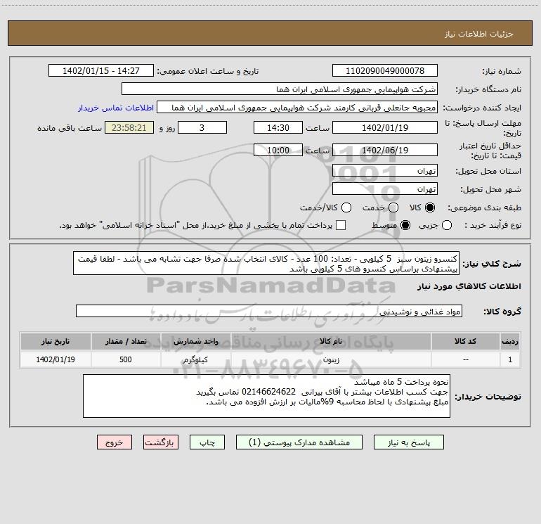 شرح کلی نیاز: کنسرو زیتون سبز 5 کیلویی - تعداد: 100 عدد - کالای انتخاب شده صرفا جهت تشابه می باشد - لطفا قیمت پیشنهادی براساس کنسرو های 5 کیلویی باشد
