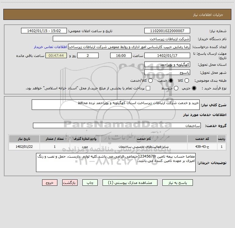 شرح کلی نیاز: خرید و خدمت شرکت ارتباطات زیرساخت استان کهگیلویه و بویراحمد نرده محافظ