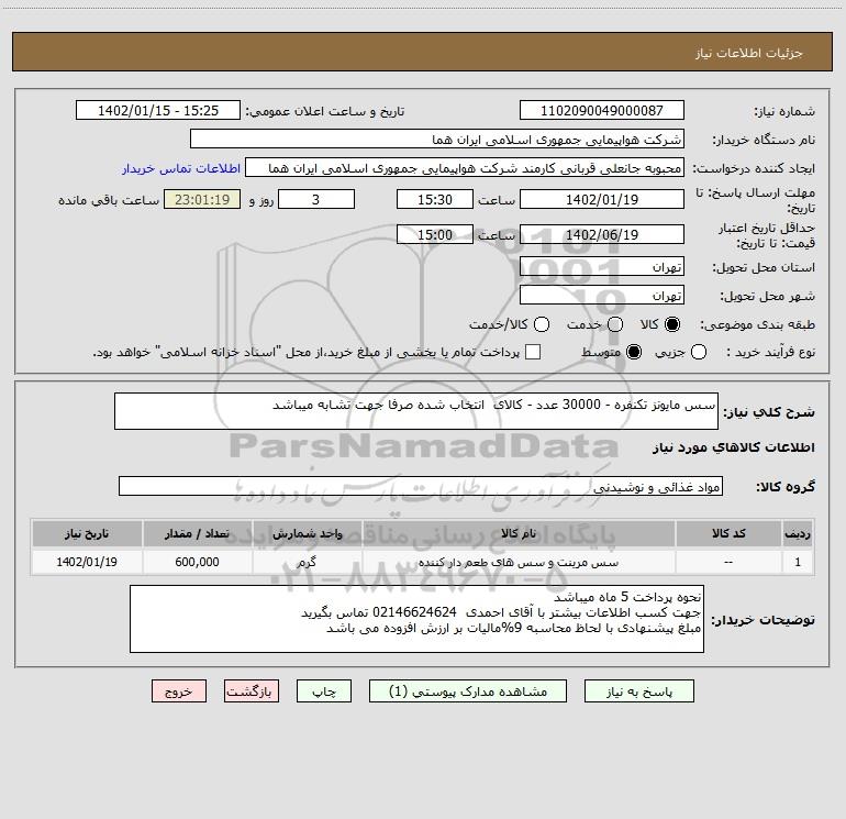 شرح کلی نیاز: سس مایونز تکنفره - 30000 عدد - کالای انتخاب شده صرفا جهت تشابه میباشد