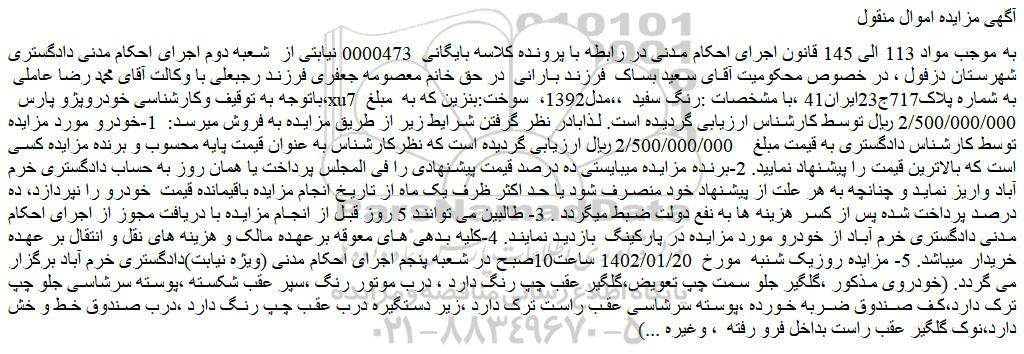 به موجب مواد 113 الی 145 قانون اجرای احکام مدنی در رابطه با پرونده کلاسه بایگانی 0000473 نیابتی از شعبه دوم اجرای احکام مدنی دادگستری شهرستان دزفول ، در خصوص محکومیت آقای سعید بساک فرزند بارانی در حق خانم معصومه جعفری فرزند رجبعلی با وکالت آقای محمد رضا عاملی ،باتوجه به توقیف وکارشناسی خودروپژو پارس xu7 به شماره پلاک717ج23ایران41 ،با مشخصات :رنگ سفید ،،مدل1392، سوخت:بنزین که به مبلغ 2/500/000/000 ریال توسط کارشناس ارزیابی گردیده است. لذابادر نظر گرفتن شرایط زیر از طریق مزایده به فروش میرسد: 1-خودرو مورد مزایده توسط کارشناس دادگستری به قیمت مبلغ 2/500/000/000 ریال ارزیابی گردیده است که نظرکارشناس به عنوان قیمت پایه محسوب و برنده مزایده کسی است که بالاترین قیمت را پیشنهاد نمایید. 2-برنده مزایده میبایستی ده درصد قیمت پیشنهادی را فی المجلس پرداخت یا همان روز به حساب دادگستری خرم آباد واریز نماید و چنانچه به هر علت از پیشنهاد خود منصرف شود یا حد اکثر ظرف یک ماه از تاریخ انجام مزایده باقیمانده قیمت خودرو را نپردازد، ده درصد پرداخت شده پس از کسر هزینه ها به نفع دولت ضبط میگردد . 3- طالبین می توانند 5 روز قبل از انجام مزایده با دریافت مجوز از اجرای احکام مدنی دادگستری خرم آباد از خودرو مورد مزایده در پارکینگ بازدید نمایند. 4-کلیه بدهی های معوقه برعهده مالک و هزینه های نقل و انتقال بر عهده خریدار میباشد. 5- مزایده روزیک شنبه مورخ 1402/01/20 ساعت10صبح در شعبه پنجم اجرای احکام مدنی (ویژه نیابت)دادگستری خرم آباد برگزار می گردد. (خودروی مذکور ،گلگیر جلو سمت چپ تعویض،گلگیر عقب چپ رنگ دارد ، درب موتور رنگ ،سپر عقب شکسته ،پوسته سرشاسی جلو چپ ترک دارد،کف صندوق ضربه خورده ،پوسته سرشاسی عقب راست ترک دارد ،زیر دستگیره درب عقب چپ رنگ دارد ،درب صندوق خط و خش دارد،نوک گلگیر عقب راست بداخل فرو رفته ، وغیره ...)