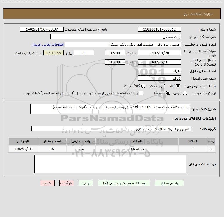 شرح کلی نیاز: 15 دستگاه دیسک سخت ssd 1.92Tb طبق پیش نویس قرارداد پیوست(ایران کد مشابه است)