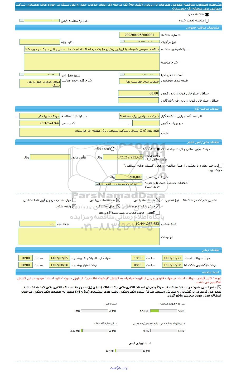 عنوان/موضوع مناقصهمناقصه عمومی همزمان با ارزیابی (یکپارچه) یک مرحله ای انجام خدمات حمل و نقل سبک در حوزه های عملیاتی شرکت سهامی برق منطقه ای خوزستان