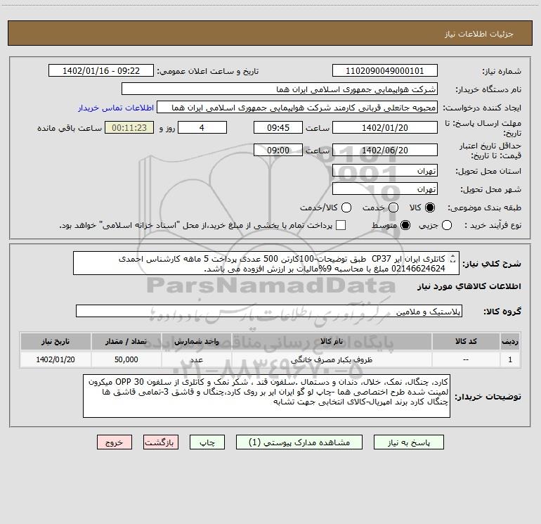 شرح کلی نیاز: کاتلری ایران ایر CP37 طبق توضیحات-100کارتن 500 عددی پرداخت 5 ماهه کارشناس احمدی 02146624624 مبلغ با محاسبه 9%مالیات بر ارزش افزوده می باشد.