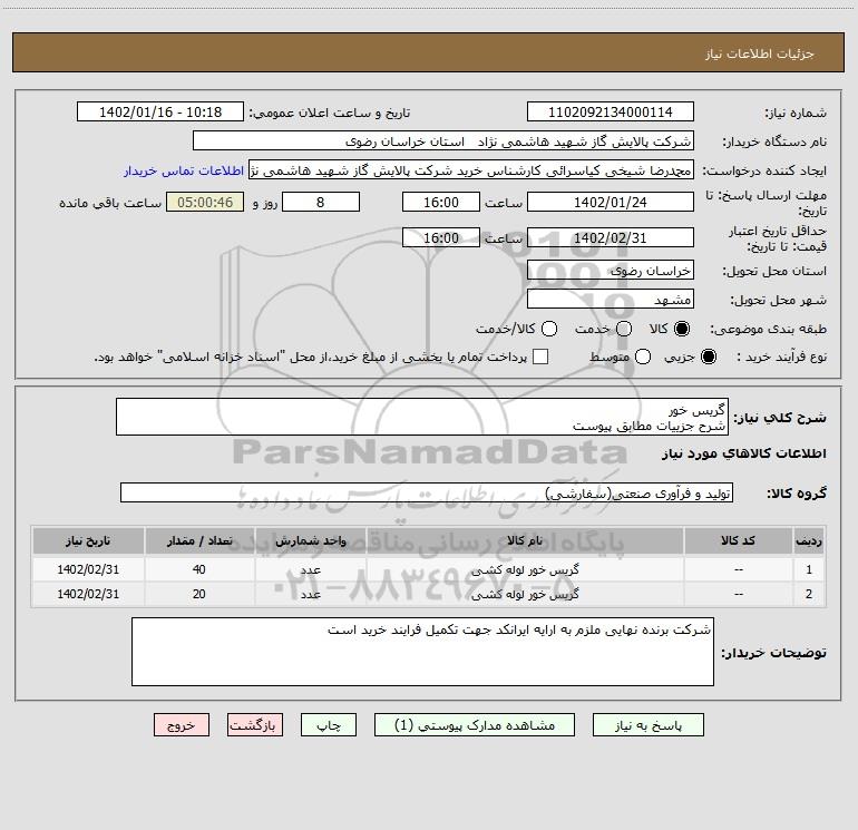 نام دستگاه خریدار:شرکت پالایش گاز شهید هاشمی نژاد استان خراسان رضوی