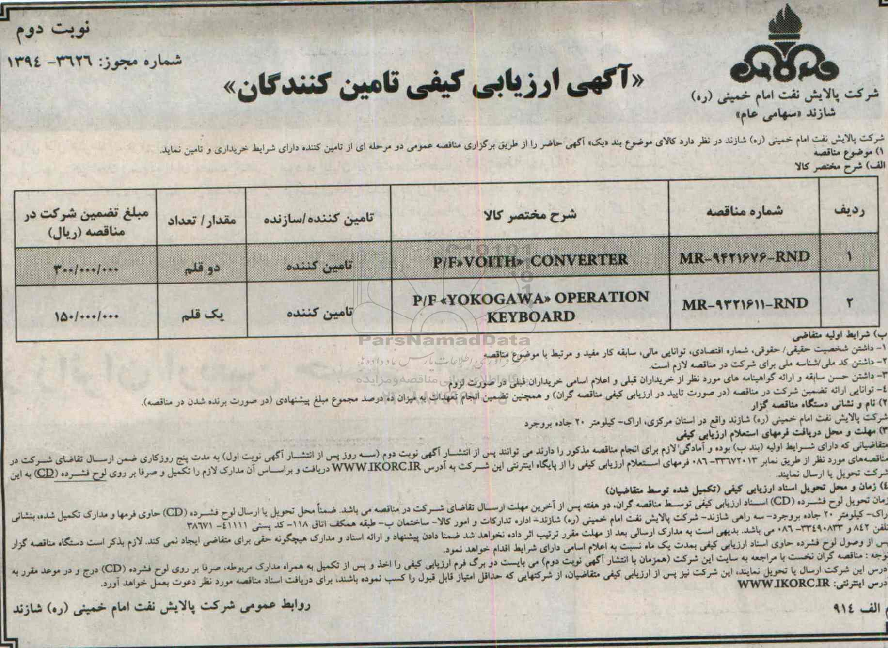 مناقصه P/F VOITH CONVERTER از کلیه افراد متخصص و شرکت‌ها واجد شرایط دعوت به عمل می‌آید در مناقصه با کد خبرگزاری پارس نماد: 566746 شرکت نمایند. این مناقصه در تاریخ 1394/07/25 شروع و مهلت آن تا تاریخ 1394/08/03 میباشد.