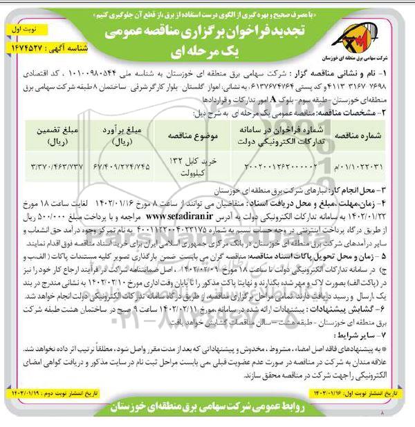 تجدید مناقصه خرید کابل 132 کیلوولت از کلیه افراد متخصص و شرکتها واجد شرایط دعوت به عمل میآید در مناقصه با کد خبرگزاری پارس نماد: 5667738 شرکت نمایند.