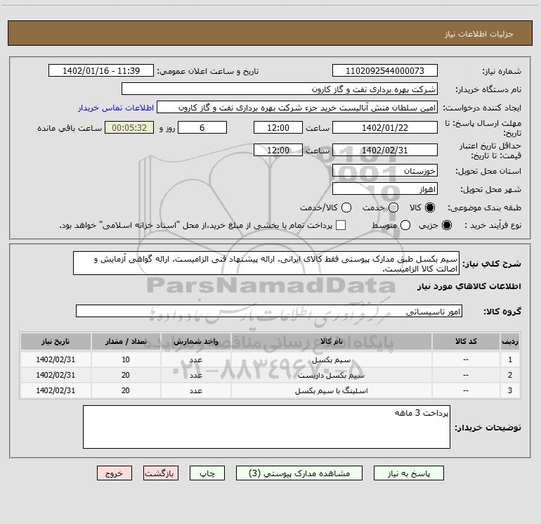 شرح کلی نیاز: سیم بکسل طبق مدارک پیوستی فقط کالای ایرانی. ارائه پیشنهاد فنی الزامیست. ارائه گواهی آزمایش و اصالت کالا الزامیست.