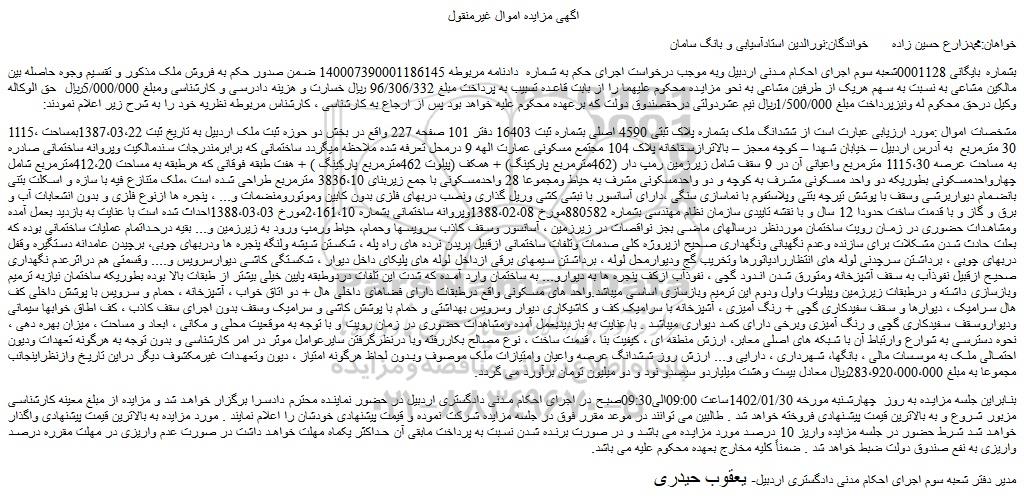 بشماره بایگانی 0001128شعبه سوم اجرای احکام مدنی اردبیل وبه موجب درخواست اجرای حکم به شماره دادنامه مربوطه 140007390001186145 ضمن صدور حکم به فروش ملک مذکور و تقسیم وجوه حاصله بین مالکین مشاعی به نسبت به سهم هریک از طرفین مشاعی به نحو مزایده محکوم علیهما را از بابت قاعده تسبیب به پرداخت مبلغ 96/306/332 ریال خسارت و هزینه دادرسی و کارشناسی ومبلغ 5/000/000ریال حق الوکاله وکیل درحق محکوم له ونیزپرداخت مبلغ 1/500/000ریال نیم عشردولتی درحقصندوق دولت که برعهده محکوم علیه خواهد بود پس از ارجاع به کارشناسی ، کارشناس مربوطه نظریه خود را به شرح زیر اعلام نمودند: