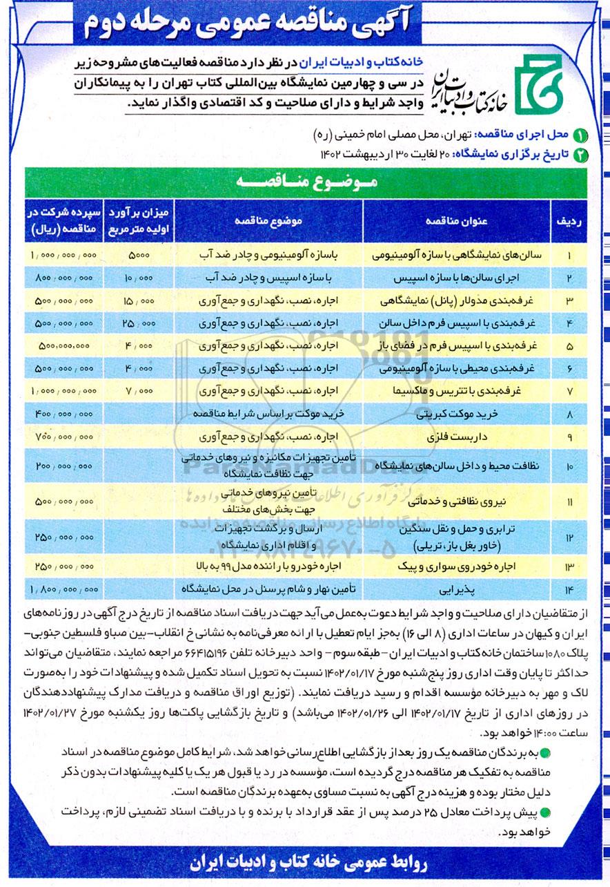 خانه کتاب و ادبیات ایران در نظر دارد مناقصه فعالیت های مشروحه زیر در سی و چهارمین نمایشگاه بین المللی کتاب تهران را به پیمانکاران واجد شرایط و دارای صلاحیت واگذار نماید