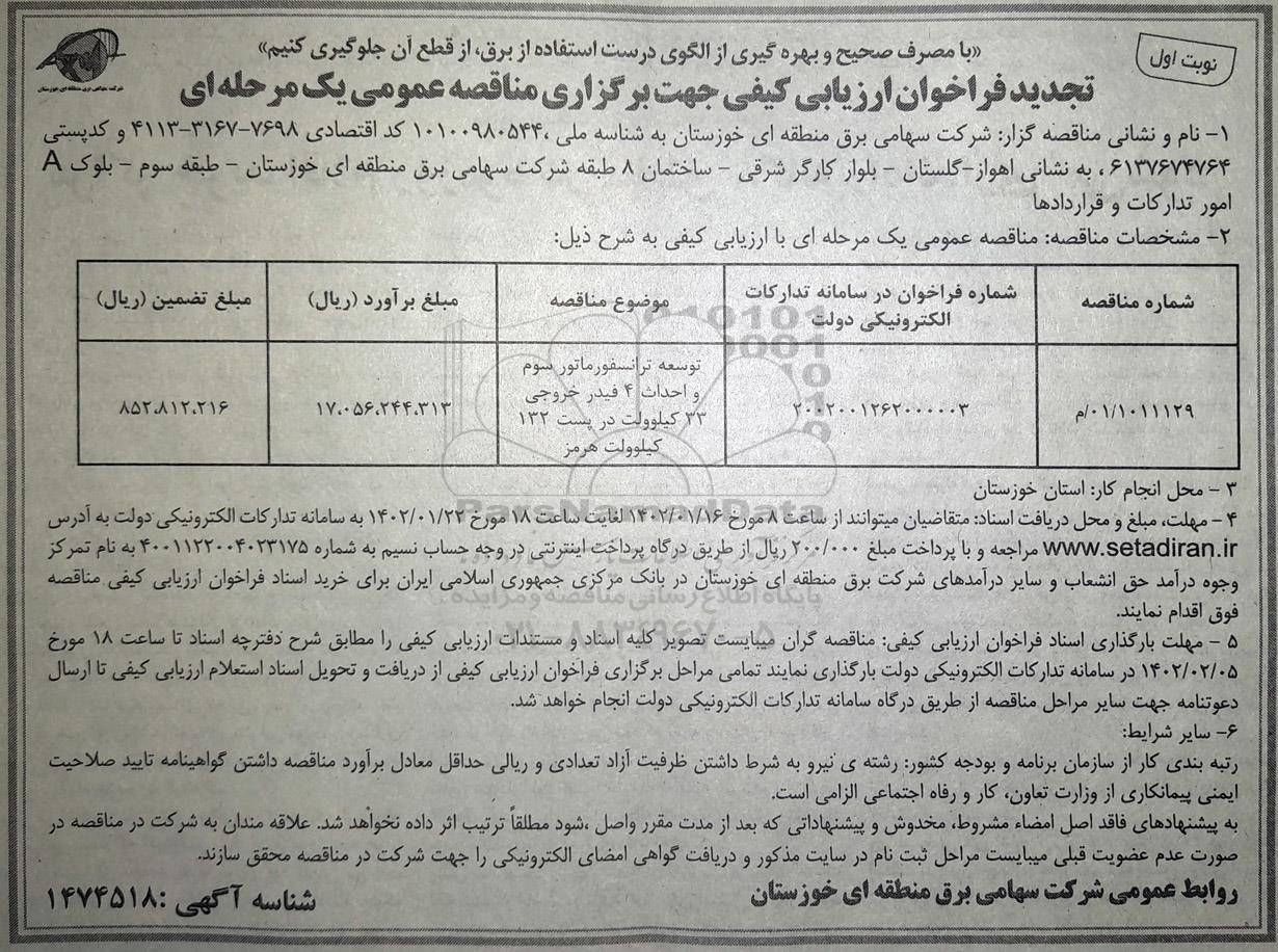 فراخوان ارزیابی کیفی توسعه ترانسفورماتور سوم و احداث 4 فیدر خروجی -تجدید , فراخوان ارزیابی کیفی توسعه ترانسفورماتور سوم و احداث 4 فیدر خروجی -تجدید