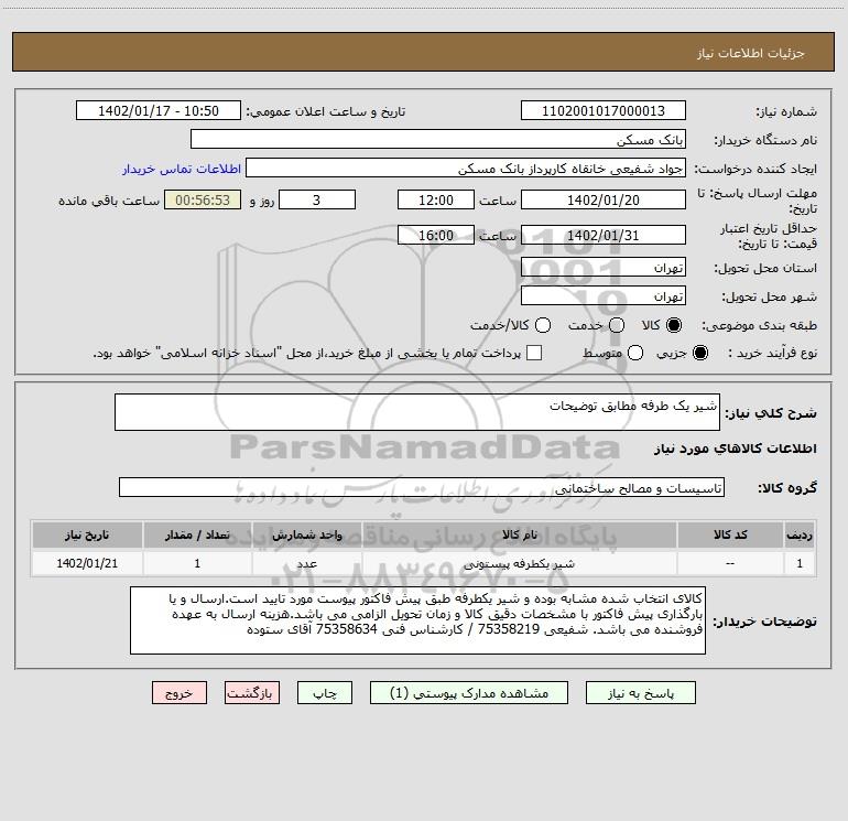 شرح کلی نیاز: شیر یک طرفه مطابق توضیحات