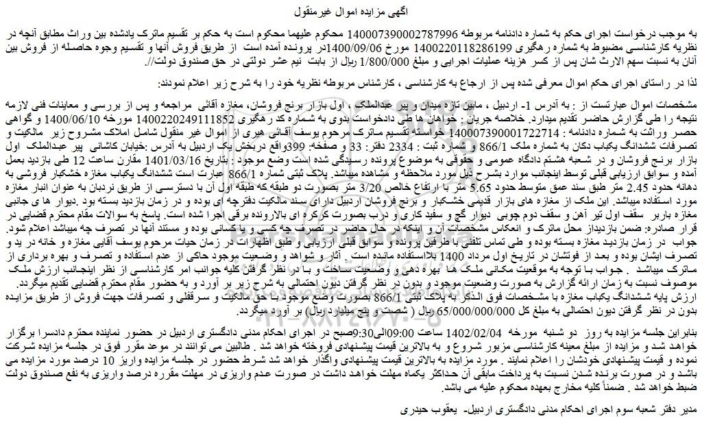مشخصات اموال عبارتست از : به آدرس 1- اردبیل ، مابین تازه میدان و پیر عبدالملک ، اول بازار برنج فروشان، مغازه آقائی مراجعه و پس از بررسی و معاینات فنی لازمه نتیجه را طی گزارش حاضر تقدیم میدارد. خلاصه جریان : خواهان ها طی دادخواست بدوی به شماره کد رهگیری 1400220249111852 مورخه 1400/06/10 و گواهی حصر وراثت به شماره دادنامه : 140007390001722714 خواسته تقسیم ماترک مرحوم یوسف آقائی هیری از اموال غیر منقول شامل املاک مشروح زیر مالکیت و تصرفات ششدانگ یکباب دکان به شماره ملک 866/1 و شماره ثبت : 2334 دفتر: 33 و صفخه: 399واقع دربخش یک اردبیل به آدرس :خیابان کاشانی پیر عبدالملک اول بازار برنج فروشان و در شعبه هشتم دادگاه عمومی و حقوقی به موضوع پرونده رسیدگی شده است وضع موجود : بتاریخ 1401/03/16 مقارن ساعت 12 طی بازدید بعمل آمده و سوابق ارزیابی قبلی توسط اینجانب موارد بشرح ذیل مورد ملاحظه و مشاهده میباشد. پلاک ثبتی شماره 866/1 عبارت است ششدانگ یکباب مغازه خشکبار فروشی به دهانه حدود 2.45 متر طبق سند عمق متوسط حدود 5.65 متر با ارتفاع خالص 3/20 متر بصورت دو طبقه که طبقه اول آن با دسترسی از طریق نردبان به عنوان انبار مغازه مورد استفاده میباشد. این ملک از مغازه های بازار قدیمی خشکبار و برنج فروشان اردبیل دارای سند مالکیت دفترچه ای بوده و در زمان بازدید بسته بود .دیوار ها ی جانبی مغازه باربر سقف اول تیر آهن و سقف دوم چوبی دیوار گچ و سفید کاری و درب بصورت کرکره ای بالارونده برقی اجرا شده است. پاسخ به سوالات مقام محترم قضایی در قرار صادره: ضمن بازدیداز محل ماترک و انعکاس مشخصات آن و اینکه در حال حاضر در تصرف چه کسی و یا کسانی بوده و مستند آنها در تصرف چه میباشد اعلام شود. جواب در زمان بازدید مغازه بسته بوده و طی تماس تلفنی با طرفین پرونده و سوابق قبلی ارزیابی و طبق اظهارات در زمان حیات مرحوم یوسف آقایی مغازه و خانه در ید و تصرف ایشان بوده و بعد از فوتشان در تاریخ اول مرداد 1400 بلااستفاده مانده است . آثار و شواهد و وضعیت موجود حاکی از عدم استفاده و تصرف و بهره برداری از ماترک میباشد . جواب با توجه به موقعیت مکانی ملک ها بهره دهی و وضعیت ساخت و با در نظر گرفتن کلیه جوانب امر کارشناسی از نظر اینجانب ارزش ملک موصوف نسبت به زمان ارائه گزارش به صورت وضعیت موجود و بدون در نظر گرفتن دیون احتمالی به شرح زیر بر آورد و به حضور مقام محترم قضایی تقدیم میگردد. ارزش پایه ششدانگ یکباب مغازه با مشخصات فوق الذکر به پلاک ثبتی 866/1 بصورت وضع موجود با حق مالکیت و سرقفلی و تصرفات جهت فروش از طریق مزایده بدون در نظر گرفتن دیون احتمالی به مبلغ کل 65/000/000/000 ریال ( شصت و پنج میلیارد ریال) بر آورد میگردد.
