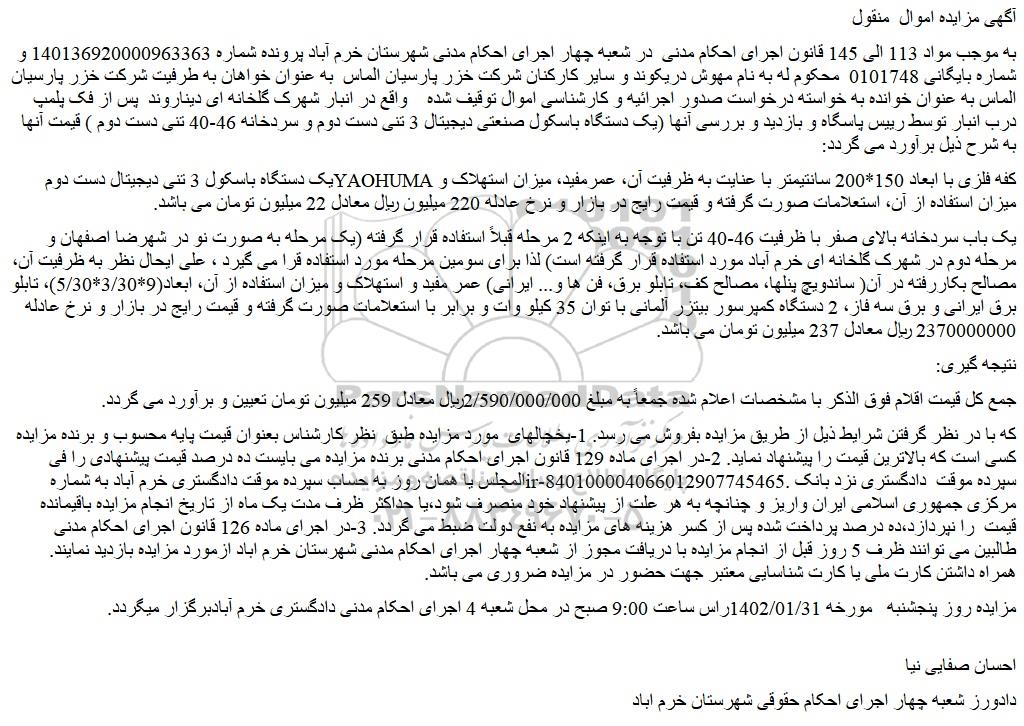 به موجب مواد 113 الی 145 قانون اجرای احکام مدنی در شعبه چهار اجرای احکام مدنی شهرستان خرم آباد پرونده شماره 140136920000963363 و شماره بایگانی 0101748 محکوم له به نام مهوش دریکوند و سایر کارکنان شرکت خزر پارسیان الماس به عنوان خواهان به طرفیت شرکت خزر پارسیان الماس به عنوان خوانده به خواسته درخواست صدور اجرائیه و کارشناسی اموال توقیف شده واقع در انبار شهرک گلخانه ای دیناروند پس از فک پلمپ درب انبار توسط رییس پاسگاه و بازدید و بررسی آنها (یک دستگاه باسکول صنعتی دیجیتال 3 تنی دست دوم و سردخانه 46-40 تنی دست دوم ) قیمت آنها به شرح ذیل برآورد می گردد: