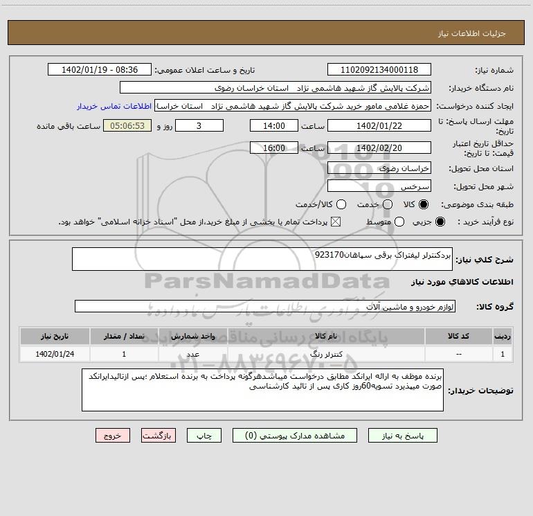 نام دستگاه خریدار:شرکت پالایش گاز شهید هاشمی نژاد استان خراسان رضوی