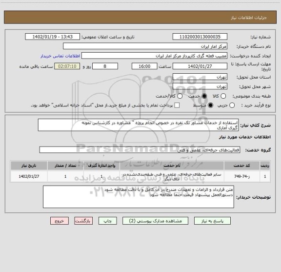 شرح کلی نیاز: استفاده از خدمات مشاور تک نفره در خصوص انجام پروژه " مشاوره در کارشناس نمونه گیری آماری