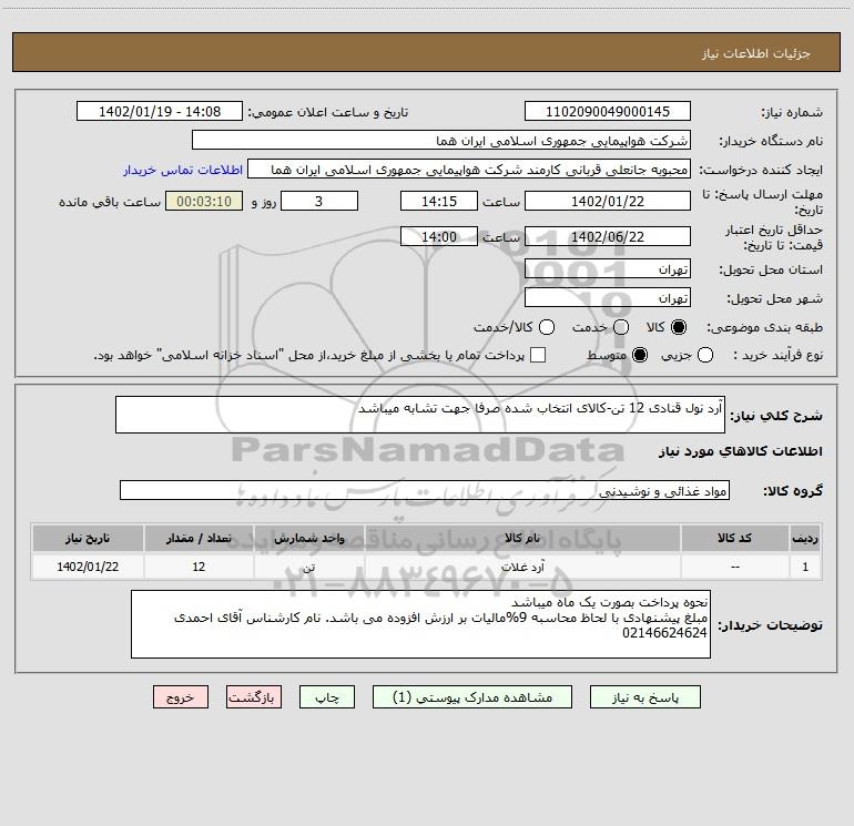 شرح کلی نیاز: آرد نول قنادی 12 تن-کالای انتخاب شده صرفا جهت تشابه میباشد