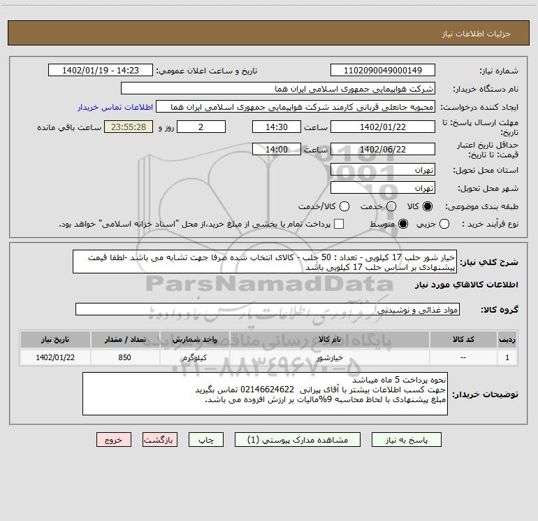شرح کلی نیاز: خیار شور حلب 17 کیلویی - تعداد : 50 حلب - کالای انتخاب شده صرفا جهت تشابه می باشد -لطفا قیمت پیشنهادی بر اساس حلب 17 کیلویی باشد
