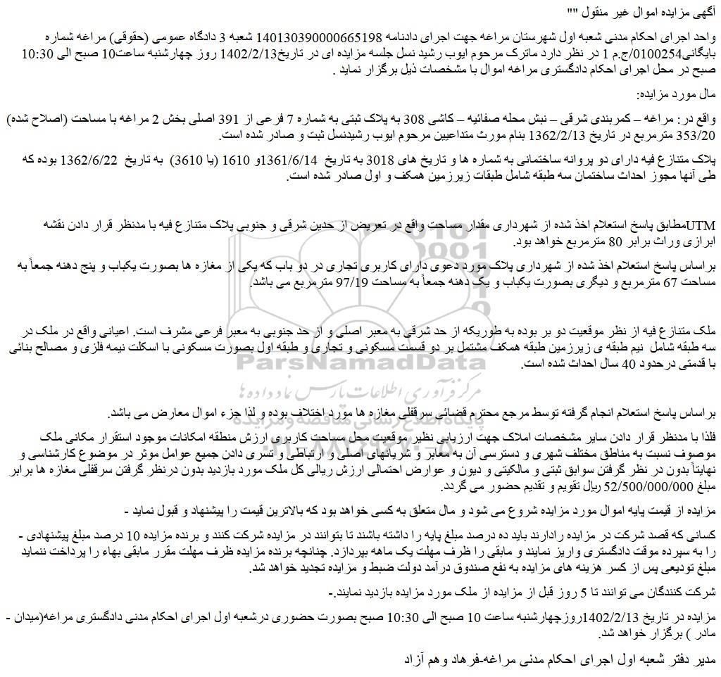 - مزایده در تاریخ 1402/2/13روزچهارشنبه ساعت 10 صبح الی 10:30 صبح بصورت حضوری درشعبه اول اجرای احکام مدنی دادگستری مراغه(میدان مادر ) برگزار خواهد شد.