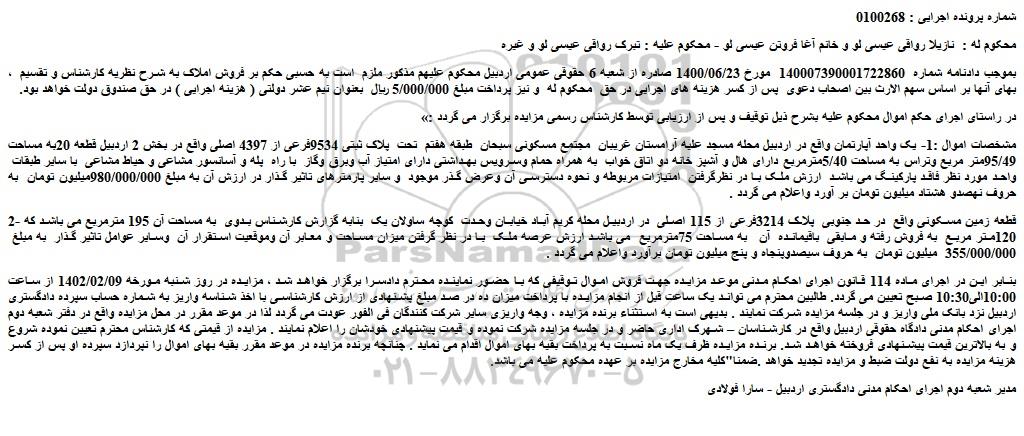 ،  بموجب دادنامه شماره  140007390001722860  مورخ 1400/06/23 صادره از شعبه 6 حقوقی عمومی اردبیل محکوم علیهم مذکور ملزم  است به حسبی حکم بر فروش املاک به شرح نظریه کارشناس و تقسیم بهای آنها بر اساس سهم الارث بین اصحاب دعوی  پس از کسر هزینه های اجرایی در حق  محکوم له  و نیز پرداخت مبلغ 5/000/000 ریال  بعنوان نیم عشر دولتی ( هزینه اجرایی ) در حق صندوق دولت خواهد بود.
