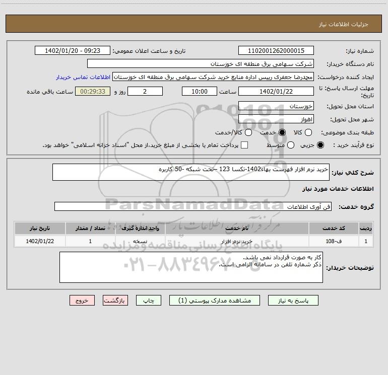 شرح کلی نیاز: خرید نرم افزار فهرست بهاء1402-تکسا 123 –تحت شبکه -50 کاربره