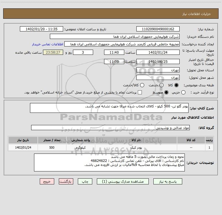 شرح کلی نیاز: پودر گلو تن- 500 کیلو - کالای انتحاب شده صرفا جهت تشابه می باشد.