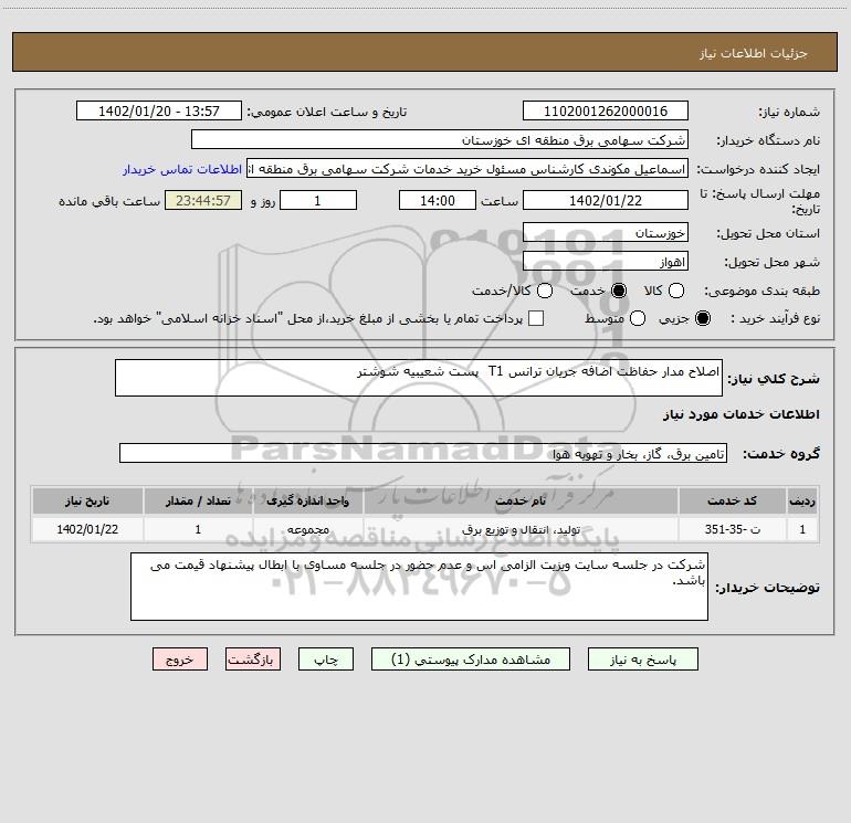 شرح کلی نیاز: اصلاح مدار حفاظت اضافه جریان ترانس T1 پست شعیبیه شوشتر