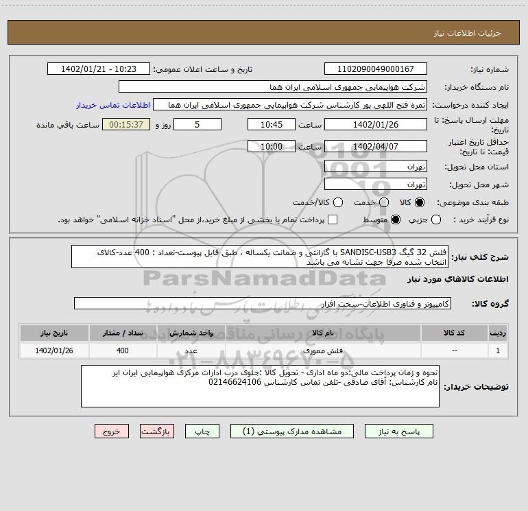 شرح کلی نیاز: فلش 32 گیگ SANDISC-USB3 با گارانتی و ضمانت یکساله ، طبق فایل پیوست-تعداد : 400 عدد-کالای انتخاب شده صرفا جهت تشابه می باشد