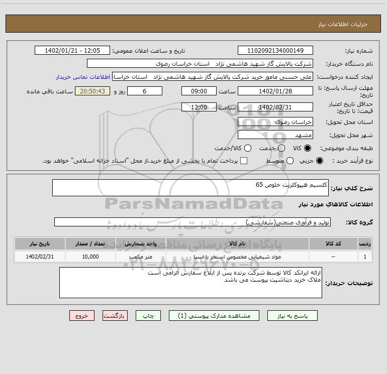 نام دستگاه خریدار:شرکت پالایش گاز شهید هاشمی نژاد استان خراسان رضوی