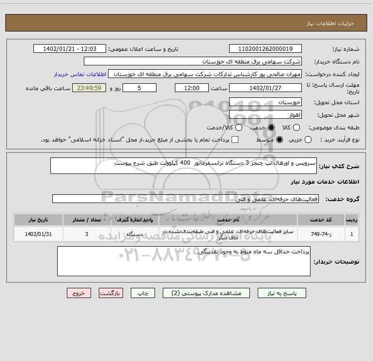 شرح کلی نیاز: سرویس و اورهال تپ چنجر 3 دستگاه ترانسفرماتور 400 کیلوولت طبق شرح پیوست