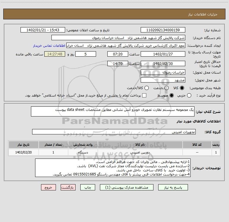 نام دستگاه خریدار:شرکت پالایش گاز شهید هاشمی نژاد استان خراسان رضوی