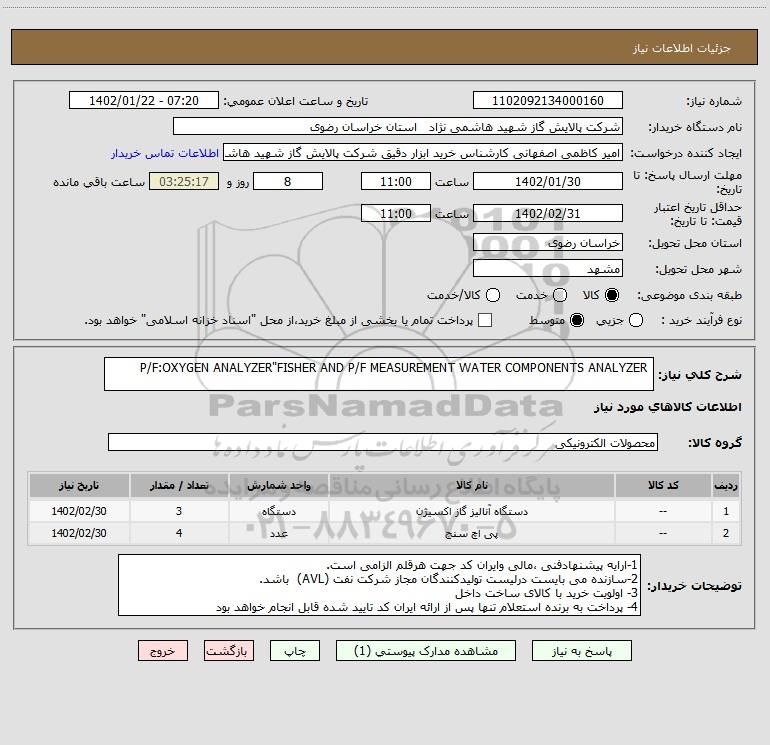 شرح کلی نیاز: P/F:OXYGEN ANALYZER"FISHER AND P/F MEASUREMENT WATER COMPONENTS ANALYZER