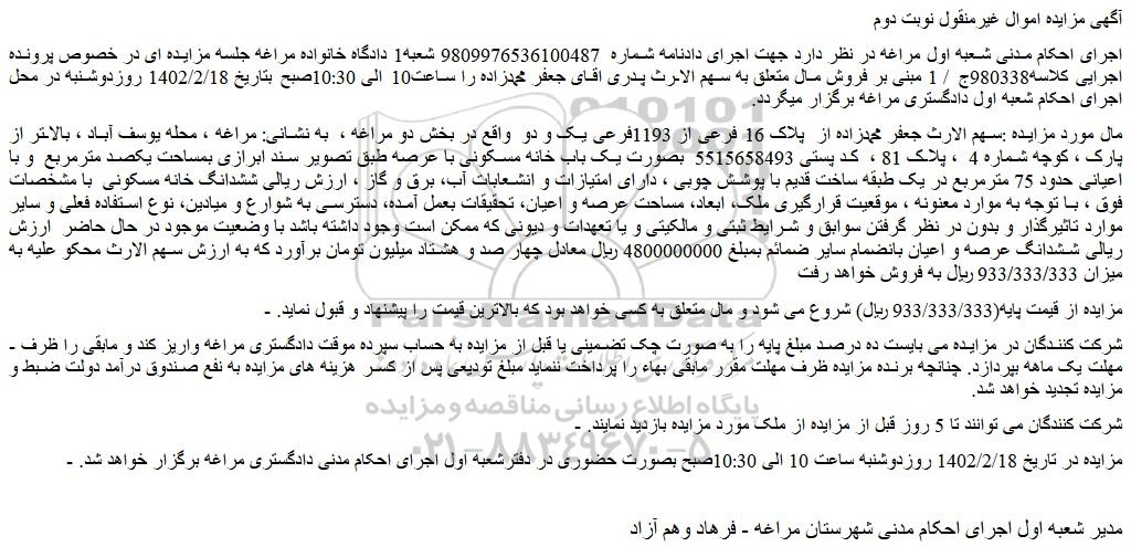 اجرای احکام مدنی شعبه اول مراغه در نظر دارد جهت اجرای دادنامه شماره  9809976536100487 شعبه1 دادگاه خانواده مراغه جلسه مزایده ای در خصوص پرونده اجرایی کلاسه980338ج / 1 مبنی بر فروش مال متعلق به سهم الارث پدری اقای جعفر محمدزاده را ساعت10 الی 10:30صبح بتاریخ 1402/2/18 روزدوشنبه در محل اجرای احکام شعبه اول دادگستری مراغه برگزار میگردد.