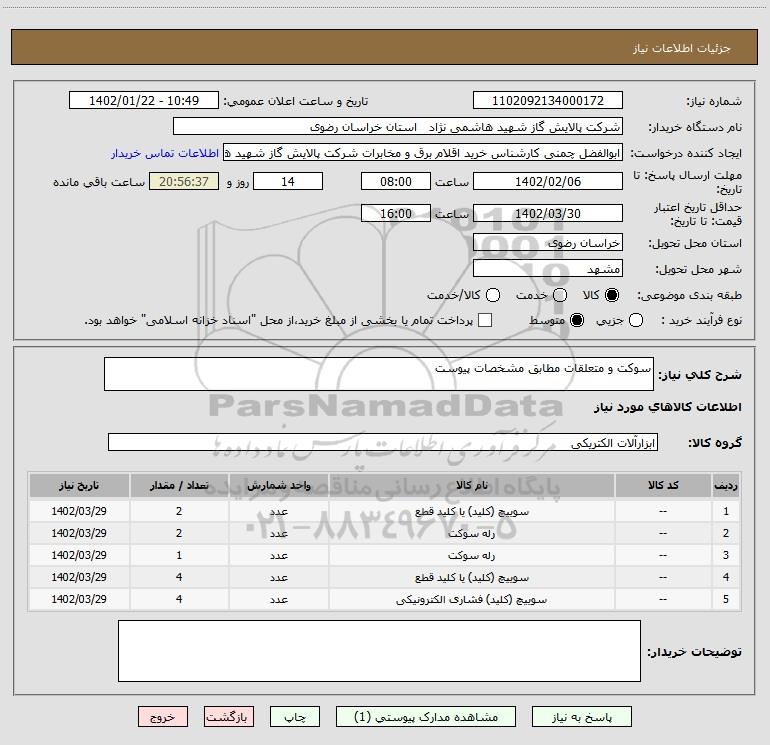 شرح کلی نیاز: سوکت و متعلقات مطابق مشخصات پیوست