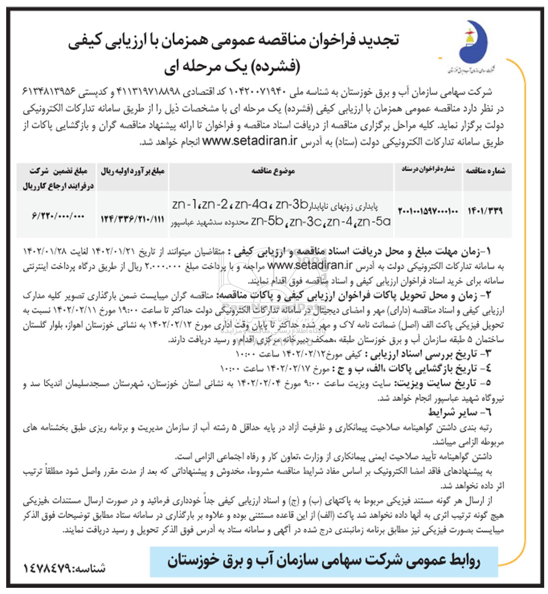 شرکت سهامی برق منطقه ای خوزستان به شناسه ملی 10420071940 کد اقتصادی 4113197188998 و کدپستی 61348113956، در نظر دارد مناقصه عمومی همزمان با ارزیابی کیفی (فشرده) ی مرحله ای با مشخصات ذیل را از طریق سامانه تدارکات الکترونیکی دولت برگزار نماید. کلیه مراحل برگزاری مناقصه از دریافت اسناد مناقصه و فراخوان تا ارائه پیشنهاد مناقصه گران و بازگشایی پاکات از طریق سامانه تدارکات الکترونیی دولت (ستاد ایران) انجام خواهد شد.