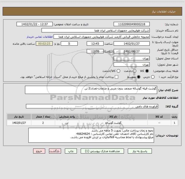 شرح کلی نیاز: گوشت فیله گوساله منجمد بدون چربی و ضایعات-تعداد:2 تن