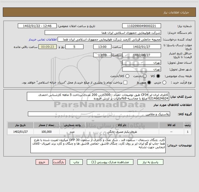شرح کلی نیاز: کاتلری ایران ایر CP34 طبق توضیحات -تعداد : 500کارتن 200 عددی-پرداخت 5 ماهه کارشناس احمدی 02146624624 مبلغ با محاسبه 9%مالیات بر ارزش افزوده