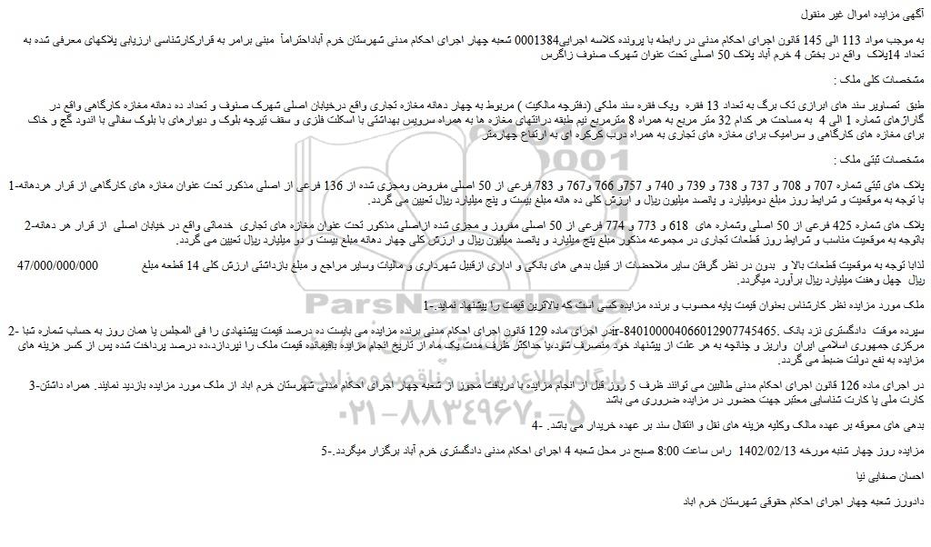 به موجب مواد 113 الی 145 قانون اجرای احکام مدنی در رابطه با پرونده کلاسه اجرایی0001384 شعبه چهار اجرای احکام مدنی شهرستان خرم آباداحترامآ مبنی برامر به قرارکارشناسی ارزیابی پلاکهای معرفی شده به تعداد 14پلاک واقع در بخش 4 خرم آباد پلاک 50 اصلی تحت عنوان شهرک صنوف زاگرس