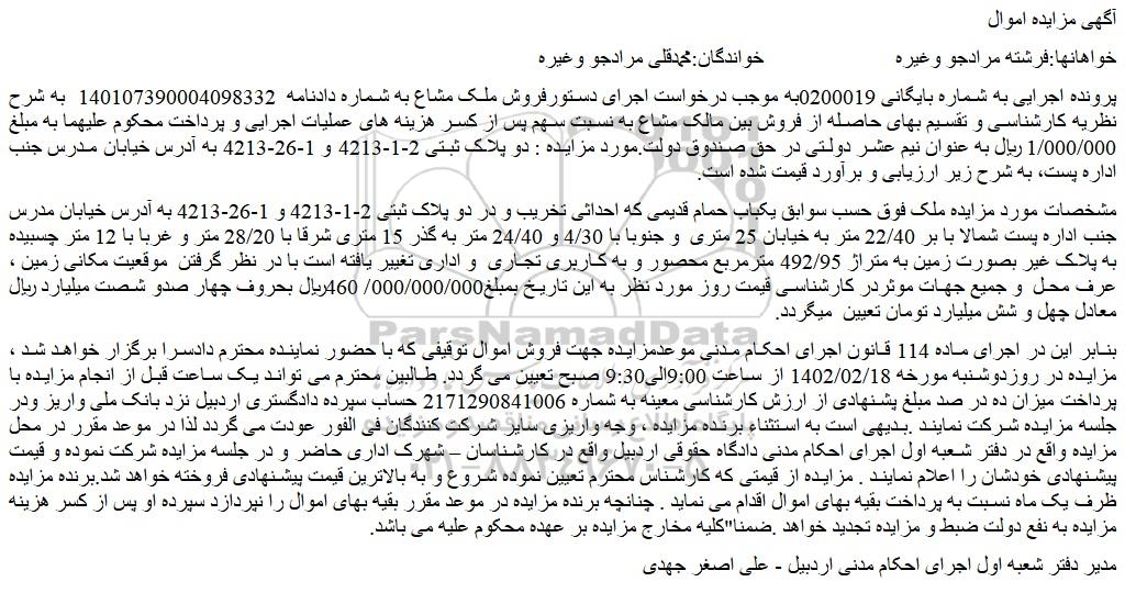 پرونده اجرایی به شماره بایگانی 0200019به موجب درخواست اجرای دستورفروش ملک مشاع به شماره دادنامه 140107390004098332 به شرح نظریه کارشناسی و تقسیم بهای حاصله از فروش بین مالک مشاع به نسبت سهم پس از کسر هزینه های عملیات اجرایی و پرداخت محکوم علیهما به مبلغ 1/000/000 ریال به عنوان نیم عشر دولتی در حق صندوق دولت.مورد مزایده : دو پلاک ثبتی 2-1-4213 و 1-26-4213 به آدرس خیابان مدرس جنب اداره پست، به شرح زیر ارزیابی و برآورد قیمت شده است.