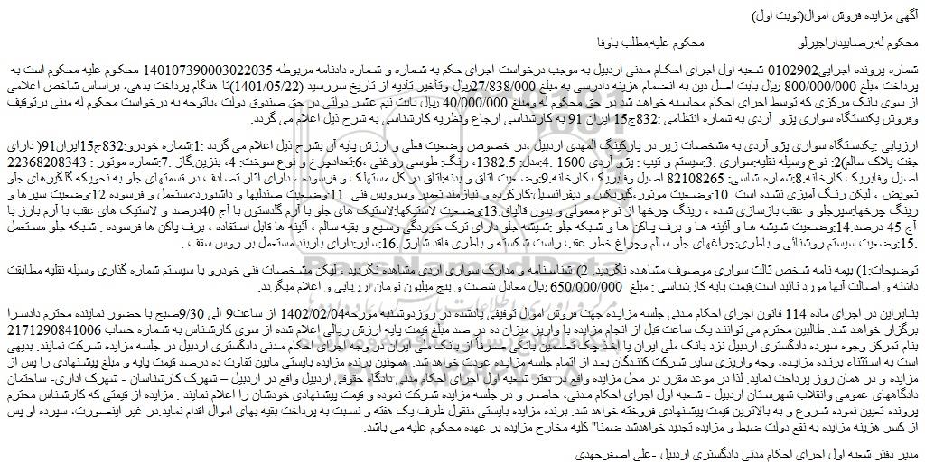 شماره پرونده اجرایی0102902 شعبه اول اجرای احکام مدنی اردبیل به موجب درخواست اجرای حکم به شماره و شماره دادنامه مربوطه 140107390003022035 محکوم علیه محکوم است به پرداخت مبلغ 800/000/000 ریال بابت اصل دین به انضمام هزینه دادرسی به مبلغ 27/838/000ریال وتأخیر تأدیه از تاریخ سررسید (1401/05/22)تا هنگام پرداخت بدهی، براساس شاخص اعلامی از سوی بانک مرکزی که توسط اجرای احکام محاسبه خواهد شد در حق محکوم له ومبلغ 40/000/000 ریال بابت نیم عشر دولتی در حق صندوق دولت ،باتوجه به درخواست محکوم له مبنی برتوقیف وفروش یکدستگاه سواری پژو  آردی به شماره انتظامی :832ج15 ایران 91 به کارشناسی ارجاع ونظریه کارشناسی به شرح ذیل اعلام می گردد.