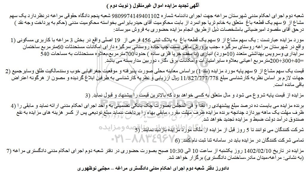 شعبه دوم اجرای احکام مدنی شهرستان مراغه جهت اجرای دادنامه شماره 9809974149401102 شعبه پنجم دادگاه حقوقی مراغه درنظردارد یک سهم مشاع از 9 سهم یک قطعه باغ متعلق به خانم ثریا جوانمرد از بابت محکومیت آقای حیدربایرامی بخواسته محکومیت مدنی (حکم به پرداخت وجه نقد ) درحق آقای مقصود امیرضیائی بامشخصات ذیل ازطریق انجام مزایده حضوری به فروش میرساند: