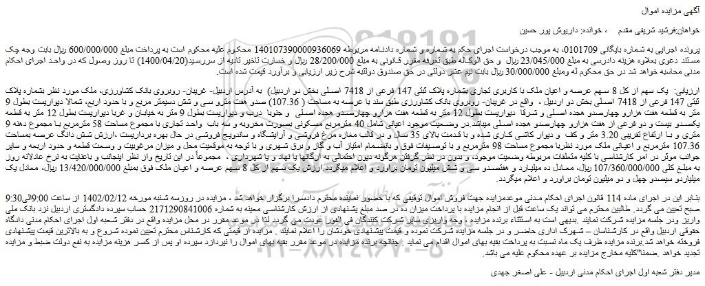 مزایده فروش یک سهم از کل 8 سهم عرصه و اعیان ملک با کاربری تجاری بشماره پلاک ثبتی 147 فرعی از 7418 اصلی , مزایده فروش یک سهم از کل 8 سهم عرصه و اعیان ملک با کاربری تجاری بشماره پلاک ثبتی 147 فرعی از 7418 اصلی