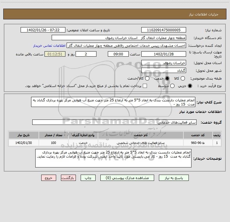 توضیحات خریدار:انجام عملیات داربست بندی به ابعاد 5*5 متر به ارتفاع 25 متر جهت منبع آب هوایی مرکز بهره برداری گناباد به مدت 15 روز - کار می بایستی مورد تایید واحد ایمنی شرکت بوده و الزامات لازم را رعایت نماید.
