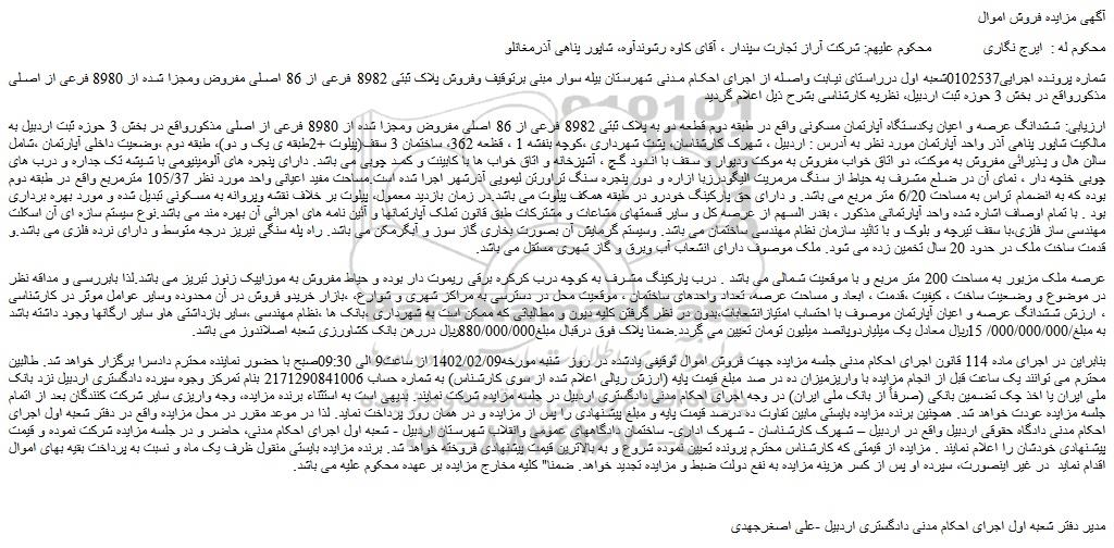 شعبه صادر کننده:شعبه اول اجرای احکام مدنی دادگستری شهرستان اردبیل/قدیم
